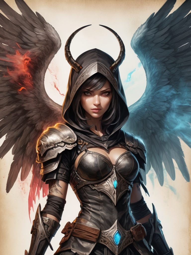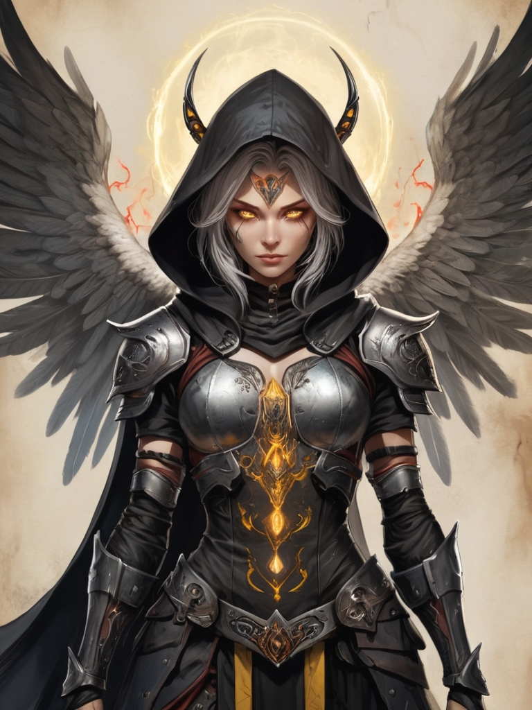 Ланита же… она была самой контрастной среди своих сестёр. Она единственная сохранила свой нимб, который своим светом слепил меня, когда я осматривал её со стороны. Её крылья в основании были белыми, а вот под самый край стали чёрными, местами по ним и рядом с ними пробегали алые молнии. У неё было два рога, что самое интересное: они словно были катализатором для её нимба, питали его, внутри светясь золотом. Лицом она походила на свою старшую сестру, волосы так же были белые, глаза – золотые. Вот только во лбу у неё был затуманенный и прикрытый пластиной кристалл, а от глаз по скулам спускались то ли шрамы, то ли демонические отростки. В груди и в животе же у неё было четыре кристалла, которые горели золотым, лишь иногда проваливаясь в красноту. Первый был на уровне её грудей, прикрытых броней. Второй – чуть выше солнечного сплетения. Третий – чуть ниже, а четвёртый аккурат на уровне пупка. И был ещё пятый… но тот был малым и словно сам растворился в ней. Из всех четверых она была больше всех облачена в броню.