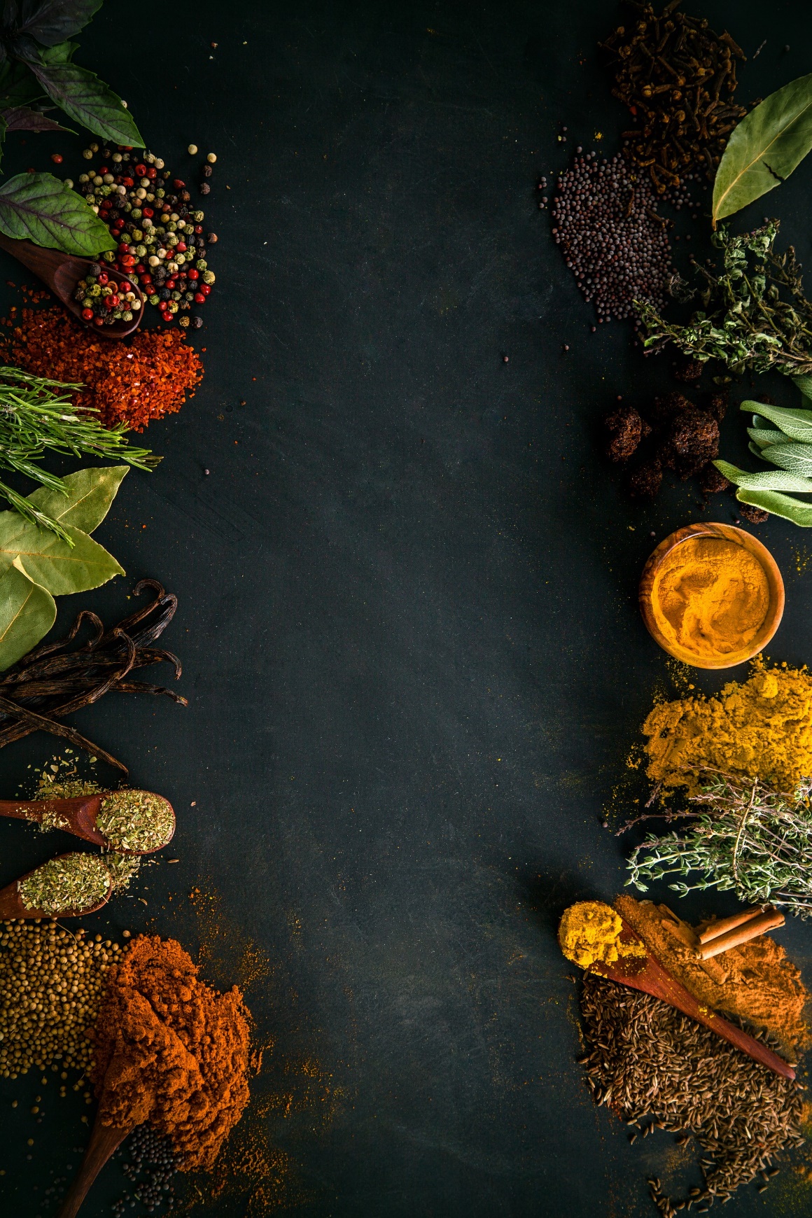 Специи и пряности: перец душистый, корица, имбирь, базилик, тмин, кардамон, перец чили, гвоздика, кориандр, зира, фенхель, пажитник, чеснок, майоран, орегано, паприка, петрушка, розмарин, шалфей, чабер, тимьян, куркума.