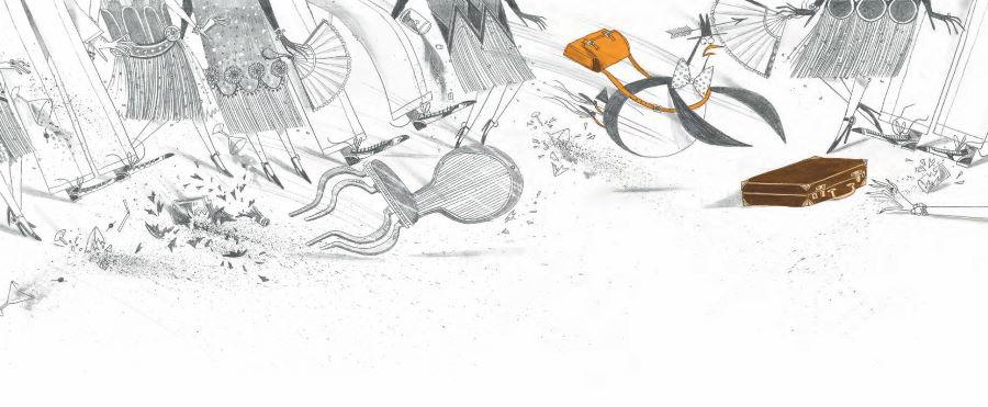 – О нет! О нет! О нет! – вопил наш главный герой. Он сжал клюв, готовясь упасть на землю и разбиться, но вдруг ударился обо что-то и снова полетел вверх. Приоткрыв зажмуренный глаз, он увидел, что оттолкнулся от одного из флагштоков, установленных у входа в отель, и теперь летит вверх, в сторону крыши – туда, где его ждут свирепые телохранители и их коварная хозяйка. Он уж и не знал, что лучше: разбиться в лепёшку или снова встретиться лицом к лицу с этими верзилами, у которых каждый кулак размером с окорок.