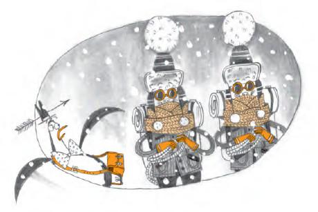 Это слегка успокоило Мистера Пингвина, но что же им всё-таки делать? Эдит права, они вот-вот разобьются. Моторы отчаянно кряхтели, и самолёт неумолимо снижался над скалистой местностью. В ночном небе вырисовывались контуры гигантских гор. Нельзя было терять ни минуты.