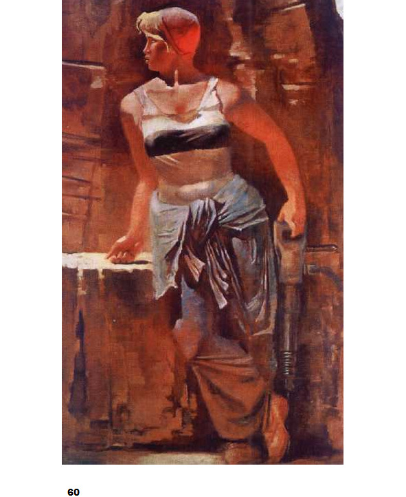 женщину в натуральном, неприглядном виде. Все эти открытые стихиям, молодые трактористки, мускулистые метростроевки с отбойными молотками, девушки-геологи в обшарпанных спецовках с тяжеленными рюкзаками за плечами, несмотря на положенные по канонам соцреализма улыбки, цветы, жизнерадостные расцветки, не вызывали, даже в советское время, ни восхищения, ни умиления, но по недосмотру, иногда попадали даже в музеи. Одно из таких полотен экспонируется у нас в Курганской картинной галерее. Оно называется одним, но емким словом «Асфальтоукладчицы» и выполнено в жесткой реалистичной манере.