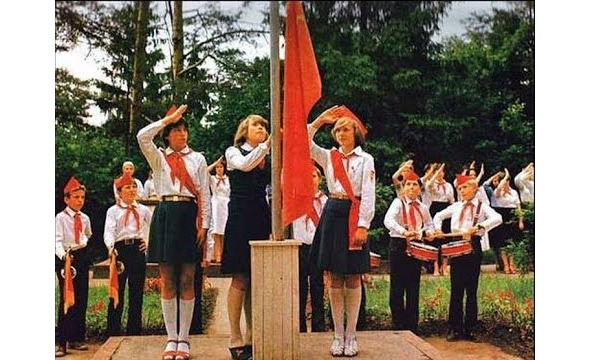На прямоугольной площадке, перед мачтой стоял пионерский строй. К строю подошла комсомолка-вожатая и поприветствовала пионеров с новым утром, громко проскандировав: «Пионеры! К борьбе за дело Ленина-Сталина будьте готовы!». «Всегда готовы!», – заверили вожатую юные пионеры.