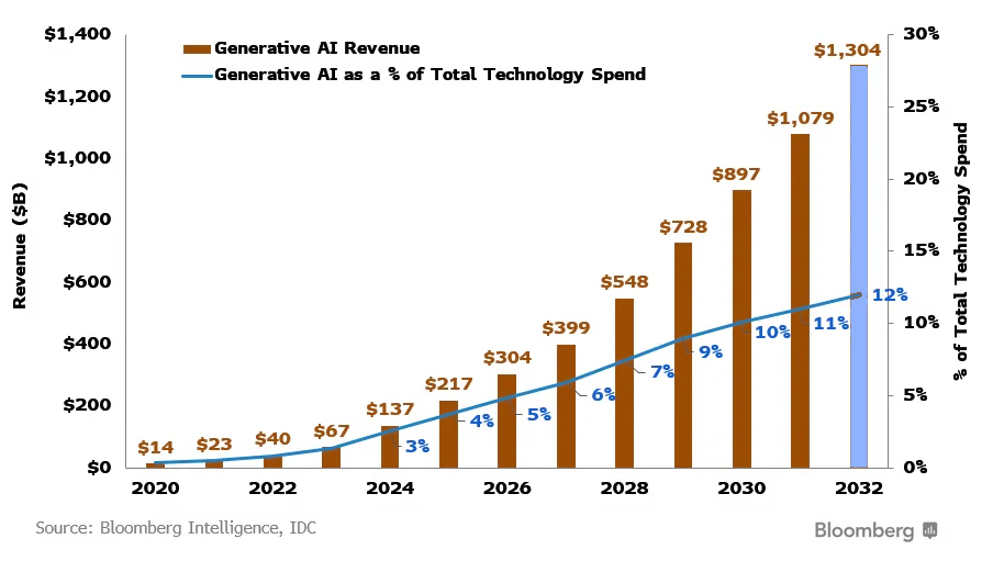 По прогнозам Bloomberg Intelligence, крупнейшим фактором роста доходов от генеративного ИИ станет спрос на инфраструктуру, необходимую для обучения моделей ИИ, который к 2032 году составит около 247 миллиардов долларов. Ожидается, что к 2032 году годовой доход от бизнеса цифровой рекламы с использованием ИИ достигнет 192 миллиардов долларов, а доход от серверов ИИ может достичь 134 миллиардов долларов, говорится в отчете. В итоге рынок генеративного искусственного интеллекта к 2032 году достигнет 1,3 триллиона долларов40.