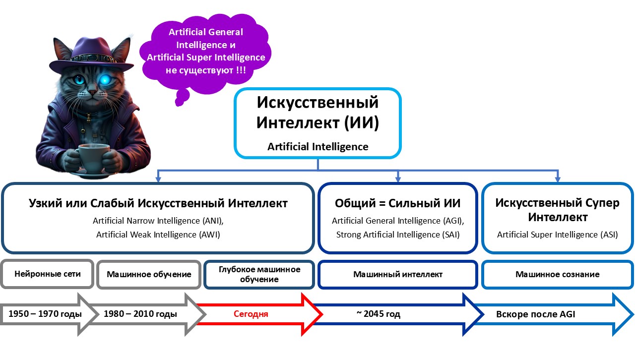 Узкий искусственный интеллект (Artificial Narrow Intelligence, ANI) – это искусственный интеллект, обученный и умеющий выполнять эффективно только определенные узкоспециализированные задачи. Слабый искусственный интеллект является самым распространенным вариантом применения технологий искусственного интеллекта, к которым, прежде всего, относят так называемое «машинное обучение» и «глубокое машинное обучение»23.