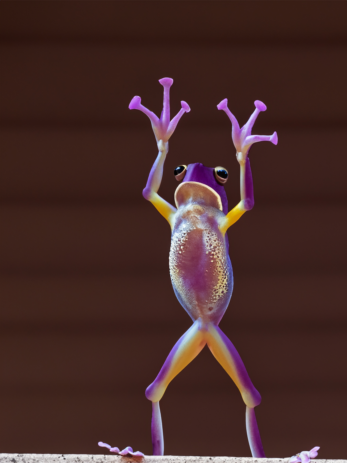 Вдруг откуда-то сверху, с потолка, по воздуху, как по ступенькам, начали маршировать фиолетовые рогатые лягушки, похожие на чертей, с бодрой песней «Не кочегары мы, не плотники».