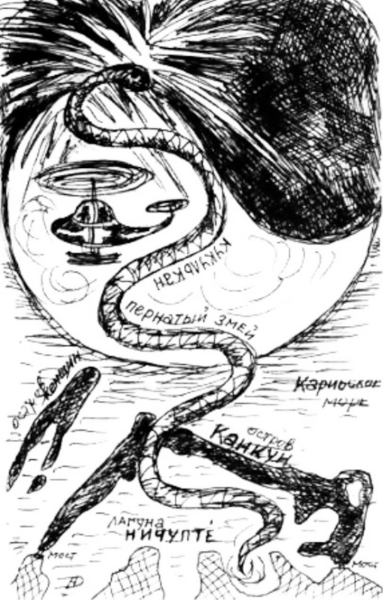 Туча вогнутой черной каплей закрыла полнеба, разделив весь мир на «инь» и «янь». Она придавила, сплющила солнце, но лучи его все же пробивались, и казалось, что это сияющая голова гигантского змея, украшенная золотыми перьями, глядит с заоблачной высоты на землю, на остров Канкун, на вертолет, где затаились мы с Петей. Пернатая голова строго склонялась над нами.