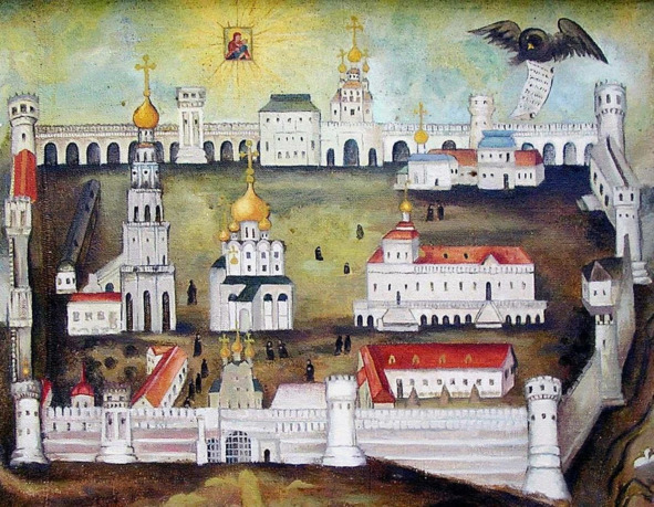 Среди многих знамён и копий, пушек да кораблей высился над ними двуглавый орёл. Грозный облик! Вот взмахнёт крыльями и полетит куда-нибудь к Воробьёвым горам, видимым по левую руку. Да не сошлись, верно, головы, куда направиться, – то ли к северу, то ли к югу…