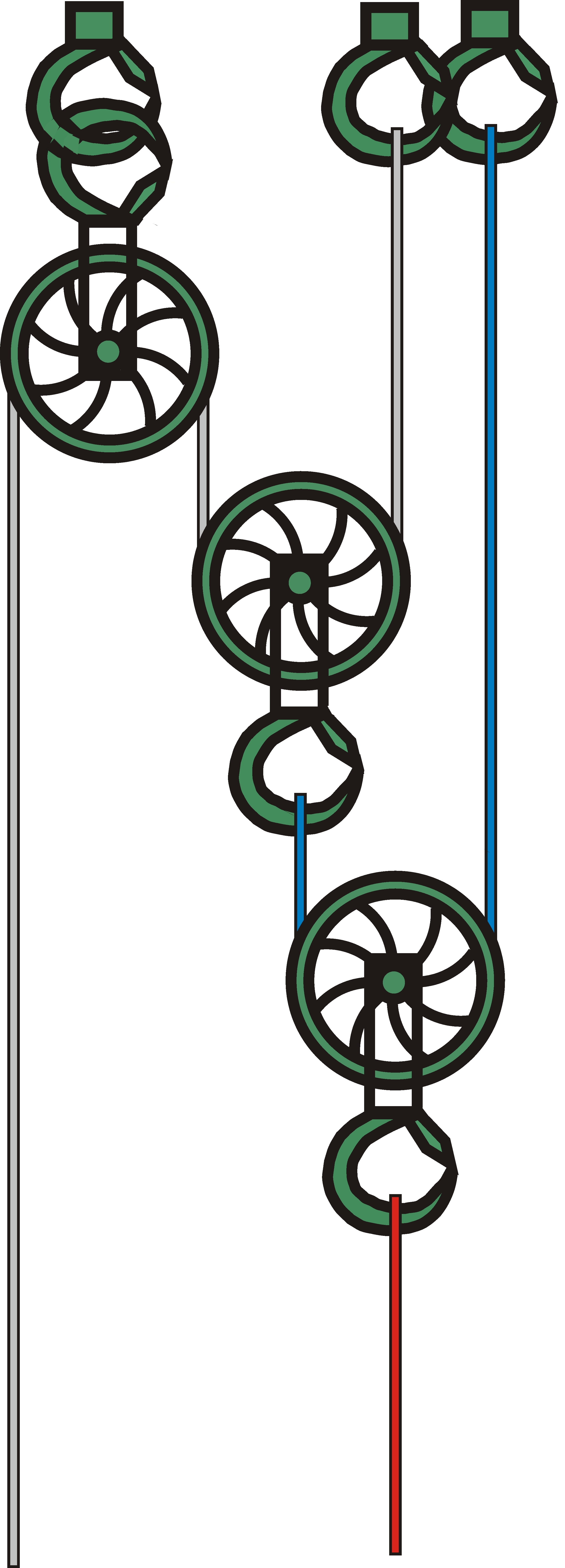 Один из блоков неподвижный. Он своим крюком зацеплен за потолочное кольцо, и висит колёсиком вниз. Через него пропущен бесцветный тросик. Один конец этого тросика свободный, наверное, за него нужно тянуть. Второй прикреплён ко второму потолочному крюку, образуя петлю, пропущенную через колёсико первого подвижного блока, висящего колёсиком вверх. С крюка этого блока свисает голубой тросик. Второй конец которого прикреплён к потолочному кольцу, образуя петлю, пропущенную через колёсико второго подвижного блока. С крюка которого свисает красный тросик. Который должен поднимать груз.
