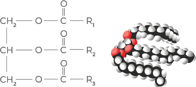 В этой схеме буквой R обозначены радикалы карбоновых кислот. Они могут быть одинаковыми или разными в зависимости от состава жира.