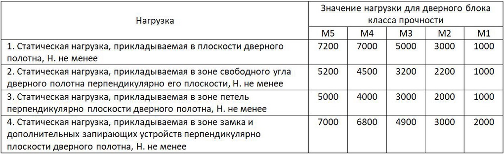 По механической прочности дверные блоки подразделяют на следующие классы: М1, М2, М3, М4, M5. Классы механической прочности дверных блоков характеризуются значениями прикладываемых статических нагрузок, приведенных в таблице ниже.