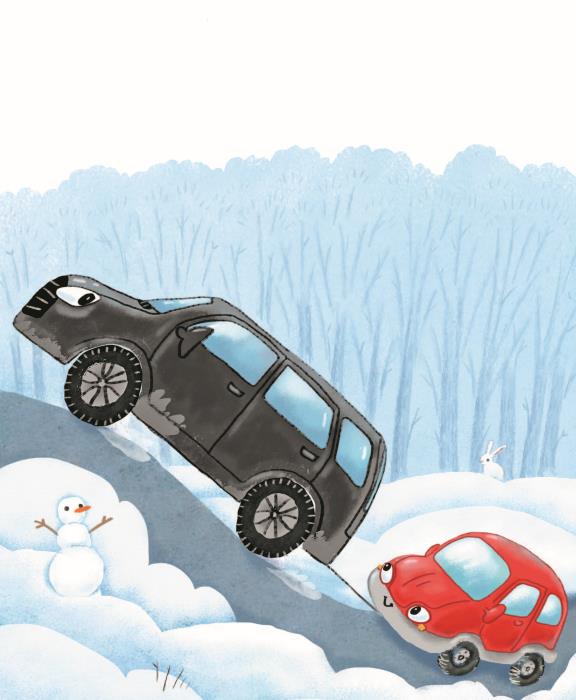 Едет по деревенской дороге чёрная машина. Дорога плохая, скользкая. А тут ещё и большой снег выпал. Видит чёрная машина: впереди маленький красный автомобильчик барахтается. Хочет в горку въехать, а не может. Снег мешает, и колёса скользят.