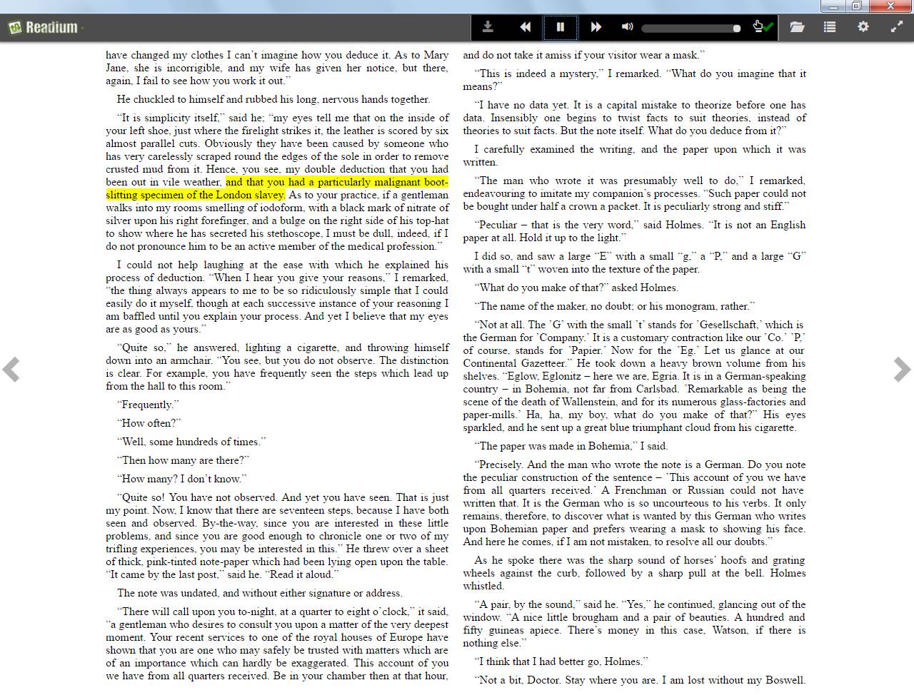 Перспективным направлением в создании аудиокниг с синхронизированным текстом является создание книг Audio-eBook на основе формата ePub 3 ([битая ссылка] http://www.readbeyond.it/ebooks.html). Формат ePub 3 (Electronic Publication) позволяет создавать и воспроизводить текст с плавающей вёрсткой (reflowable format), с синхронизацией аудио и текста (ePub 3 Media Overlays). В процессе прослушивания аудиокниги производится высвечивание зачитываемого фрагмента текста (synchronoushighlighting). Можно прослушивать аудиокнигу, начиная c любого фрагмента (touch-to-play).