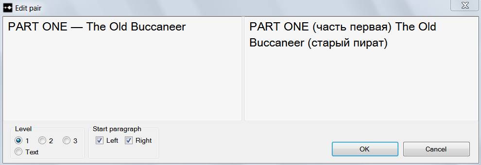 Текстовые фразы из адаптированного текста надо последовательно вырезать из текста первой главы и вставлять в правую часть таблицы редактирования (EditCurrentPair). В левой части этой таблицы находится текстовая фраза оригинала. Может потребоваться вставить несколько текстовых фраз (не более трёх). Таким путём можно добиться полного соответствия звуковых и текстовых фраз. Редактировать фразы адаптированного текста не надо, удаляя текст на английском языке или объединяя несколько фраз в одну. Как будет показано в дальнейшем, тем самым будет полностью сохранён первоначальный вид адаптированного текста.