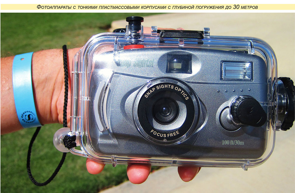 Очень удобными являются фотоаппараты со встроенными эластичными или резиновыми уплотнителями. Внешне они мало отличаются от обычных фотоаппаратов. Все ручки регулировок здесь легко доступны. На снимке сверху изображен фотоаппарат «Canon Power Shot D10». С фотоаппаратами в тонком прозрачном корпусе можно работать на глубине до 30 метров