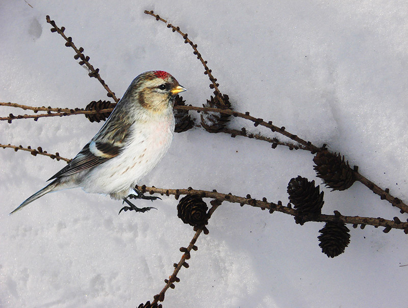 Зимой мы подкармливали семечками птиц в кормушках, повешенных в парке, недалеко от метро Ясенево и возле санатория «Узкое». Нам повезло, и мы увидели чечеток. Сначала они расправлялись с семечками подсолнуха в кормушке, а потом на снегу и после этого нашли семена на ветках лиственницы.