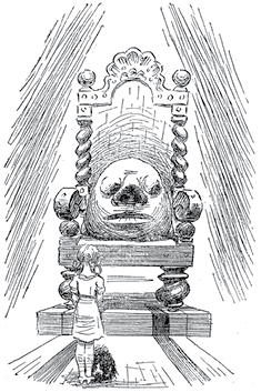 На следующее утро наступила очередь Льва идти к Гудвину, но когда он вошел в тронный зал, то отпрыгнул в изумлении: над троном качался и сиял Огненный Шар. Лев зажмурил глаза.