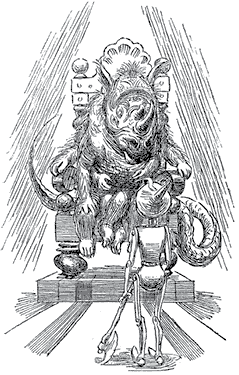 На следующий день Солдат вызвал Железного Дровосека. Когда тот явился в тронный зал, неся на плече топор, с которым никогда не расставался, он не увидел ни Живой Головы, ни прекрасной Девы. На троне громоздился чудовищный зверь. Морда у него была, как у кабана, только с рогом, и на ней было разбросано около десятка глаз, тупо смотревших в разные стороны. Штук двенадцать лап разной длины и толщины свисали с неуклюжего туловища. Кожу зверя кое-где покрывала косматая шерсть: местами кожа была голая, и на грубой серой поверхности выступали бородавчатые наросты.