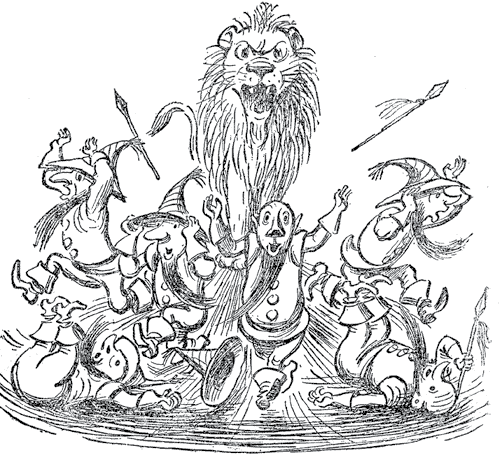 Рассерженный Лев начал подкрадываться к Шару, чтобы схватить его, но на него повеяло таким жаром, что Лев взвыл и, поджав хвост, выбежал из зала. Он вернулся к друзьям и рассказал о приеме, который устроил ему Гудвин.
