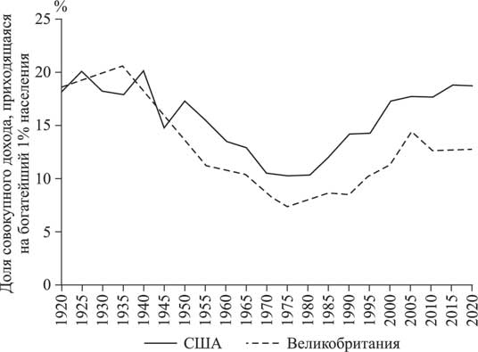 Рис. 1.1. Неравенство доходов в США и Великобритании, 1920–2020 гг.