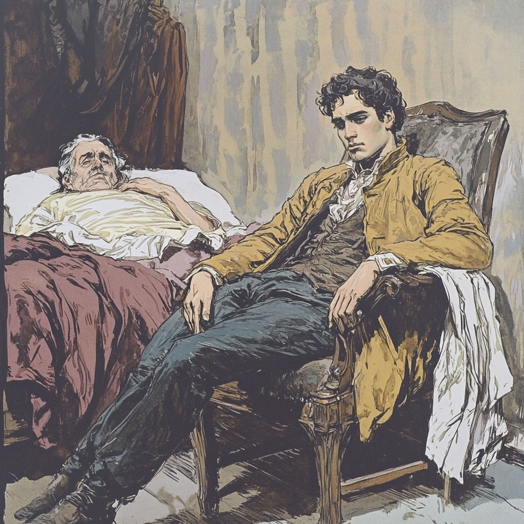 Вдруг получил он в самом делеОт управителя доклад,Что дядя при смерти в постелеИ с ним проститься был бы рад.Прочтя печальное посланье,Евгений тотчас на свиданьеСтремглав по почте поскакалИ уж заранее зевал,Приготовляясь, денег ради,На вздохи, скуку и обман(И тем я начал мой роман);Но, прилетев в деревню дяди,Его нашел уж на столе,Как дань, готовую земле.LIII