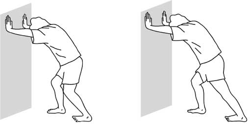 Опереться о стену, сгибая руки в локтях и не отрывая пятки от пола. Почувствовав, что пятка вот-вот оторвется от пола, задержаться в таком положении на 10 секунд, не сгибая ногу, которую растягиваете, в колене. Сделать три подхода по 10 секунд для каждой ноги.