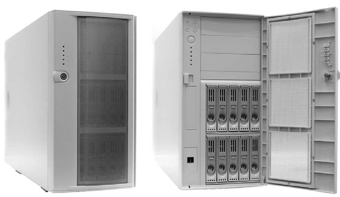 Как правило, подобные корпуса снабжены открывающейся (откидывающейся) передней крышкой с замком, которая скрывает элементы управления компьютером и утройствами хранения данных.