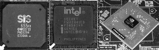 Системная логикаСистемная логика (чипсет) – главный компонент платы, отвечающий за ее функционирование, а в конечном итоге и за работу всего компьютера. Он имеет небольшие размеры и обычно состоит из нескольких микросхем (рис. 3.3).