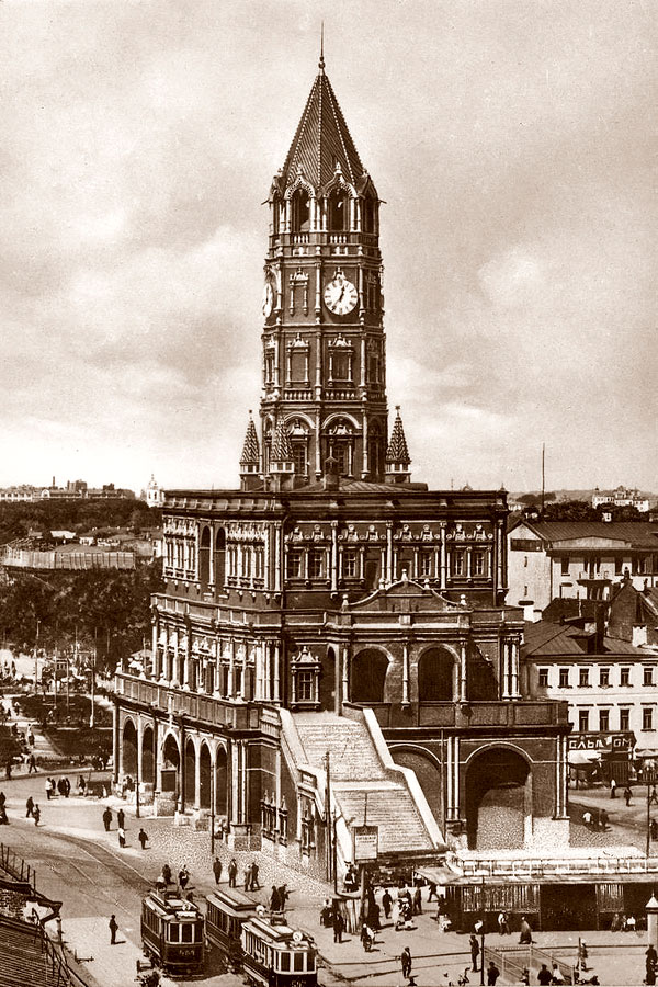 Красная площадь мощена булыжником, по ней проходили трамвайные пути. Памятник Минину и Пожарскому стоял напротив центрального подъезда ГУМа, позднее его перенесли к собору Василия Блаженного, чтобы не стеснять движения транспорта.