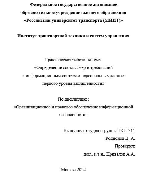 В данной практической работе мною была рассмотрена тема «Определение состава мер и требований к информационным системам персональных данных первого уровня защищенности согласно действующему законодатель-ству Российской Федерации».