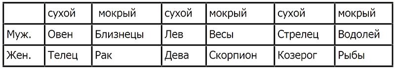 Кроме разделения на мужские и женские знаки или горячие и холодные по Аристотелю, Зодиак разделяется еще на шесть знаков сухих и шесть знаков мокрых или влажных. Эта следующая дуальная пара категорий в учении Аристотеля. Как мы помним из различного сочетания этих четырех категорий Аристотель выводил существование четырех основных стихий или элементов. Здесь Зодиак делится на пары рядом стоящих знаков, начиная с Овна. Овен и Телец сухие, следующая пара: Близнецы и Рак мокрые и так далее. Итак, сухие знаки – это Овен, Телец, Лев, Дева, Стрелец и Козерог. Мокрые это: Близнецы, Рак, Весы, Скорпион, Водолей и Рыбы. При реальном истолковании гороскопа это деление знаков не получило такого распространения как деление знаков на мужские и женские. Однако, оно важно при описании темперамента и конституции человека. Абу Машар арабский астролог свел эту классификацию знаков в удобную таблицу: