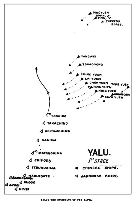 В результате китайские корабли окончательно сбились в кучу, беспорядочно перемещаясь (сказать «маневрируя» здесь нельзя) и мешая друг другу стрелять. В этих беспорядочных стычках японские корабли несколько раз пускали торпеды, но не добились ни одного попадания. Китайцы вполне благоразумно оставили свои торпеды на берегу, так как надводные аппараты представляли больше опасности для самого корабля, чем для противника.