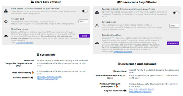 Три опции, располагающиеся ниже основных, отвечают за сетевые настройки вашего приложения Easy Diffusion. Мы их не изменяем.