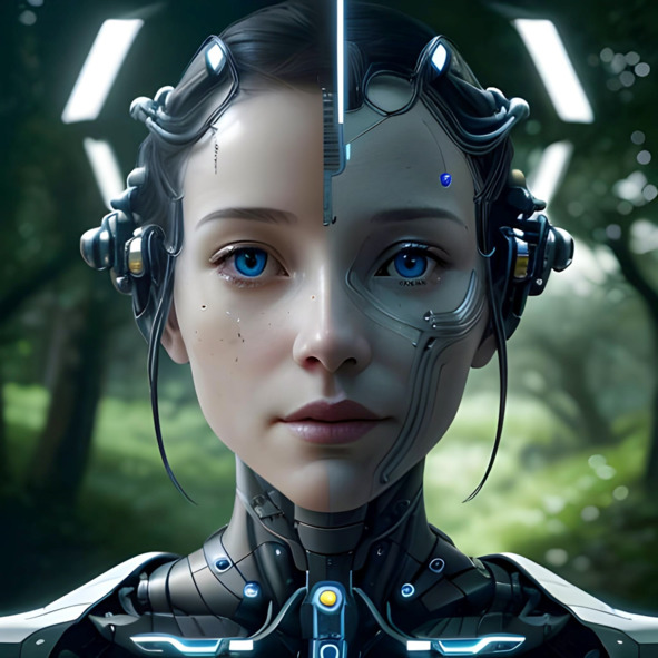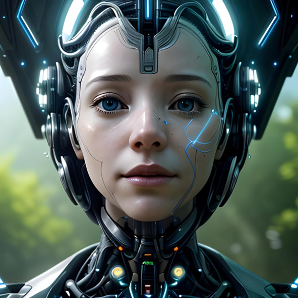 – Введем новый запрос («Prompt»): «Nouvelle AI, new artificial intelligence, cyborg face, an enchanted technological portal from the future, journey into the healing power of nature, photorealistic, perfect composition, cinematic shot, intricate details, hyper detail».