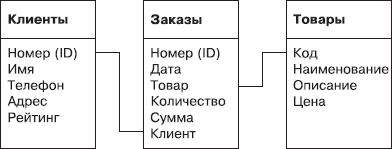 Таким образом, были перечислены атрибуты и установлены связи между таблицами. Например, если в таблице заказов есть поля Товар и Клиент, содержащие код товара и номер клиента, то таблица Заказы ссылается и на таблицу Товары, и на таблицу Клиенты.