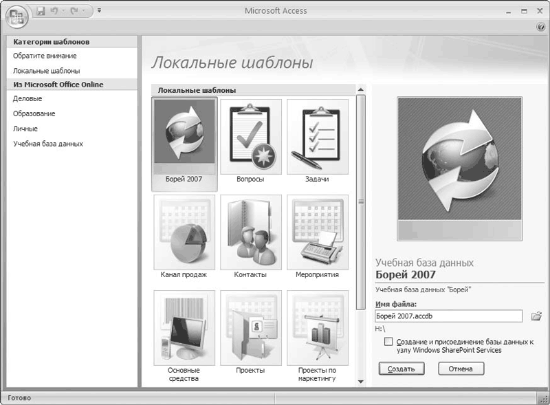 1. В левой области начального окна Access (см. рис. 1.2) выберите категорию шаблонов. В центре окна отобразится список шаблонов этой категории. Щелкните кнопкой мыши на значке подходящего шаблона (рис. 1.4).