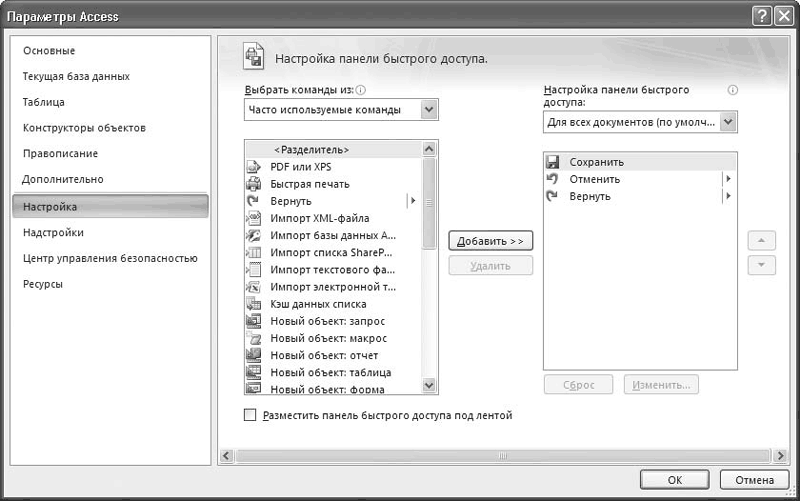 Рис. 1.7. Окно Параметры Access в режиме настройки панели быстрого доступа