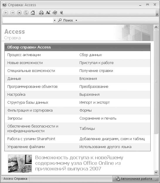 Интерфейс справочной системы Access 2007 также изменился по сравнению с предыдущими версиями. Так, помощник Microsoft Office – анимированный персонаж, дающий советы, – в новую версию справочной системы не включен.