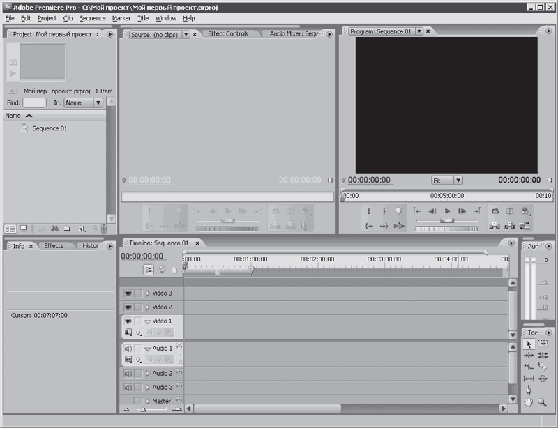 7. Нажмите кнопку OK. Диалог будет закрыт, а на экране появится главное окно программы Premiere Pro (рис. 1.3).