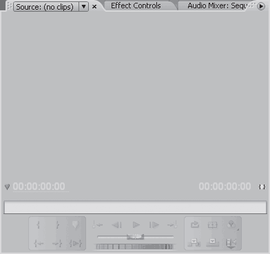 На экране Source (Источник) вы можете просмотреть клипы до помещения в последовательность, а также отредактировать их, обрезав лишние фрагменты (рис. 1.6). В данный момент в экран Source (Источник) клипы не загружены, поэтому элементы интерфейса этого окна неактивны.