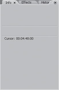 • Info (Информация) отображает информацию о выделенном клипе, звуковом или графическом файле проекта: длительность, разрешение, временную позицию начала и окончания в последовательности и т. д. Данная вкладка носит исключительно информативный характер;