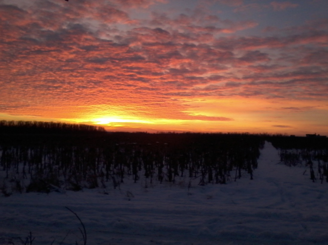 К вечеру стрельба усилилась. Мы вышли прощаться – небо полыхало изумительными, сумасшедшими красками, что захватывало дух! Величественный закат, густой, багровый, растёкшийся, подобно стали под нависшими, тяжёлыми облаками, заснеженное поле с контрастом чёрных подсолнухов и близких разрывов, словно в замедленной съёмке, взлетающие комья земли, создавали поистине ошеломляющую картину – хотелось протянуть руку, потрогать, не доверяя глазам! Природа, как будто, говорила с нами, восхищая своей мощью и великолепием, предупреждала… Этот закат сохранится в моей памяти до конца дней.