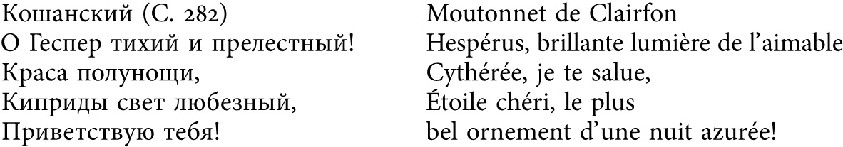 Moutonnet de Clairfon J.‐J. Anacréon, Sapho, Bion, Moschus, Théocrite, Musée, La veillée des fêtes de Vénus, Choix de Poésies de Catulle, d’ Horace et de différens Auteurs / 2e éd., revue et corrigée. T. 2. Paris, 1781. P. 1–2 («Вечерняя звезда» напечатана как первая идиллия Мосха под заглавием «Молитва пастуха» – «Prière d’ un Berger»). Чтобы убедиться в том, что Кошанский отталкивался от указанного источника, сравним начало двух переводов: