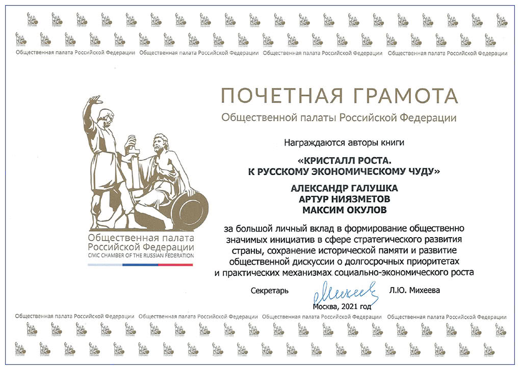 Авторы книги «КРИСТАЛЛ РОСТА. К русскому экономическому чуду» Александр Галушка, Артур Ниязметов, Максим Окулов за большой личный вклад в формирование общественно значимых инициатив в сфере стратегического развития страны, сохранение исторической памяти и развитие общественной дискуссии о долгосрочных приоритетах и практических механизмах социально-экономического роста удостоены Почетной грамоты Общественной палаты Российской Федерации.