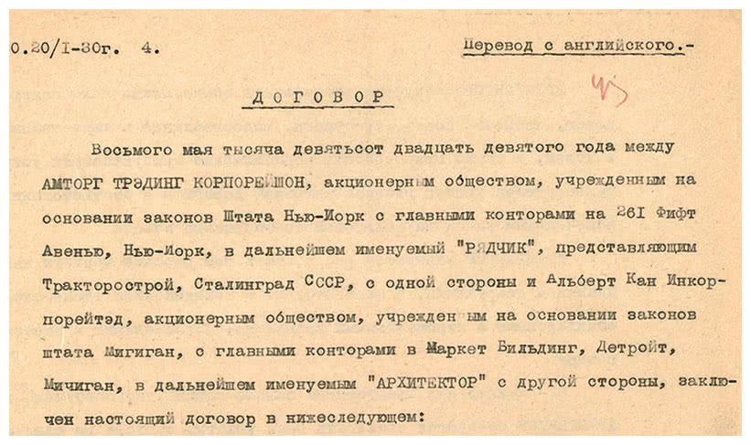 Сотрудничество России с компанией Альберта Кана начинается в 1928 году, когда «группа инженеров из Москвы приезжает в офис Albert Kahn Co., Inc. с заказом в сорок миллионов долларов США (сегодня около 615 млн долларов США. – Прим. авторов) за тракторный завод, а также с наброском программы для строительства различных сооружений общей стоимостью два миллиарда долларов» (сегодня около 31 млрд долларов США. – Прим. авторов){142}. Упомянутым «наброском программы» является часть первого и второго пятилетних планов.