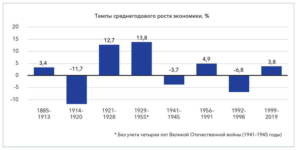 Отдельно выделены принципиально особенные для экономики страны периоды войн (1914–1920 – Первая мировая и Гражданская войны; 1941–1945 – Великая Отечественная война), когда экономика преимущественно не росла, а падала.