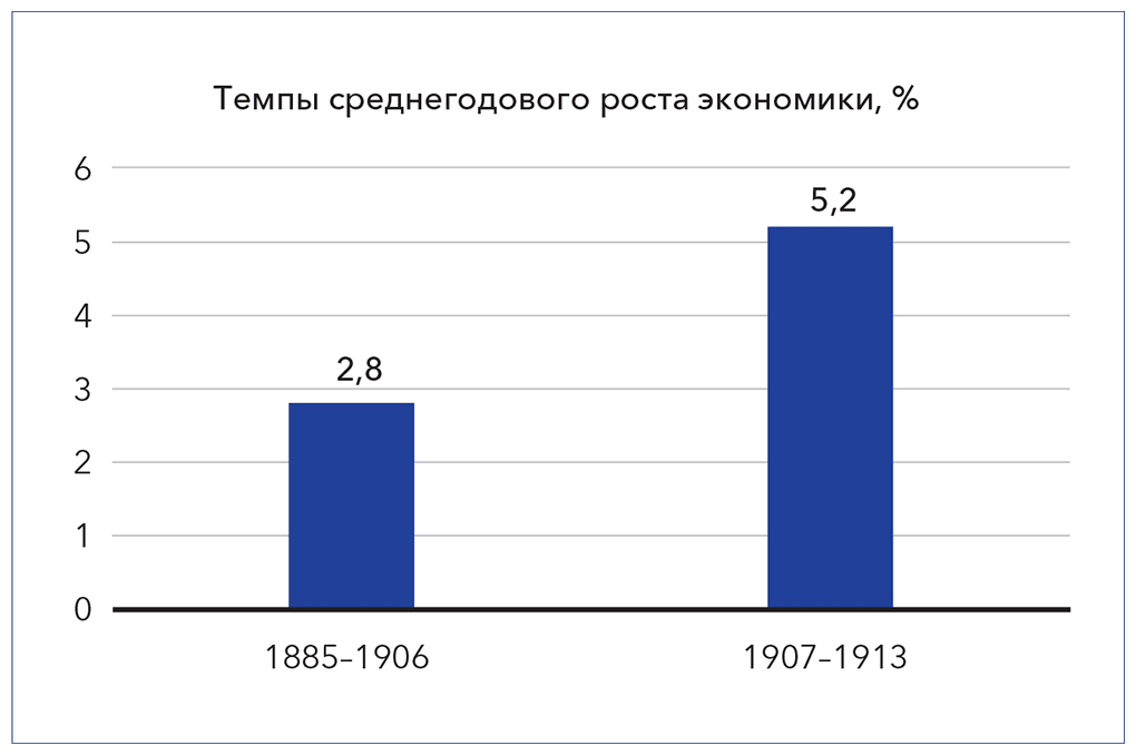 В период 1885–1913 годов среднегодовой рост экономики составляет 3,4 %. В рамках данной модели можно выделить два этапа (Рис. 2): с 1885 по 1906 год, с темпами среднегодового роста 2,8 % и с 1907 по 1913 год – период преобразований Петра Аркадьевича Столыпина, с более высокими темпами среднегодового роста (5,2 % – одни из самых высоких темпов роста экономики в мире на тот момент), когда государство, опираясь на ранее накопленный потенциал, организует большой проект освоения востока страны, активно стимулирует хозяйственную деятельность, выдает крестьянам землю и организует необходимую государственную поддержку. Без малого двукратное увеличение темпов роста становится зримым результатом новой государственной стратегии и организации в экономике.