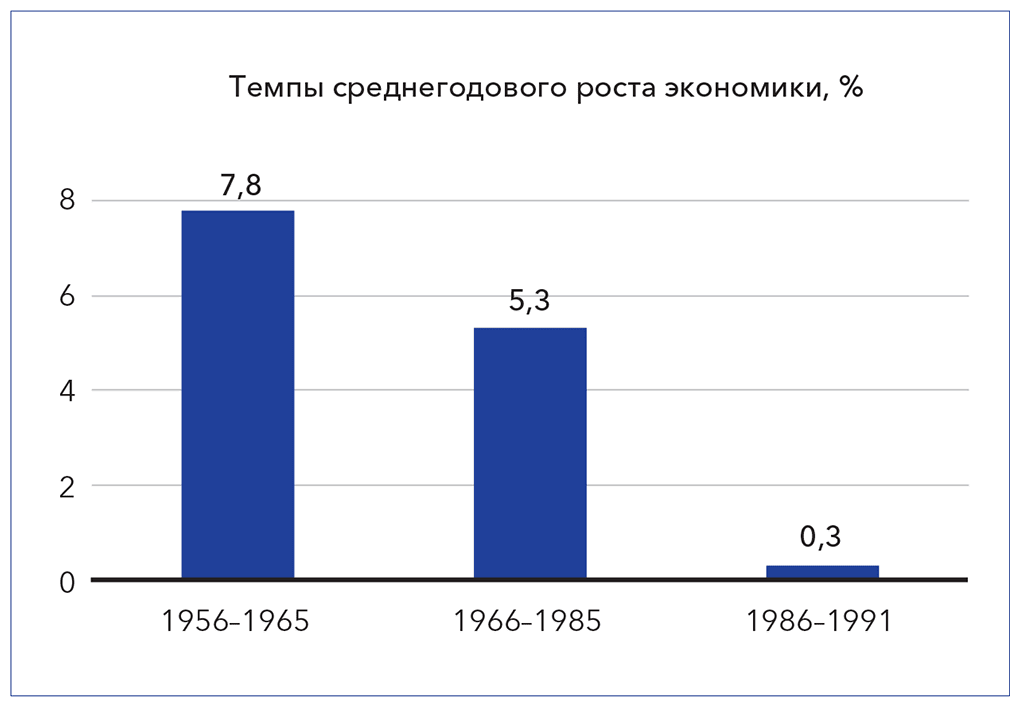 В целом в период с 1956 по 1991 год неуклонно происходит постепенное падение темпов роста экономики. В силу значительной инерции развития и большого запаса прочности ранее созданной экономической системы среднегодовые темпы роста экономики в этот период составляют 4,9 %.