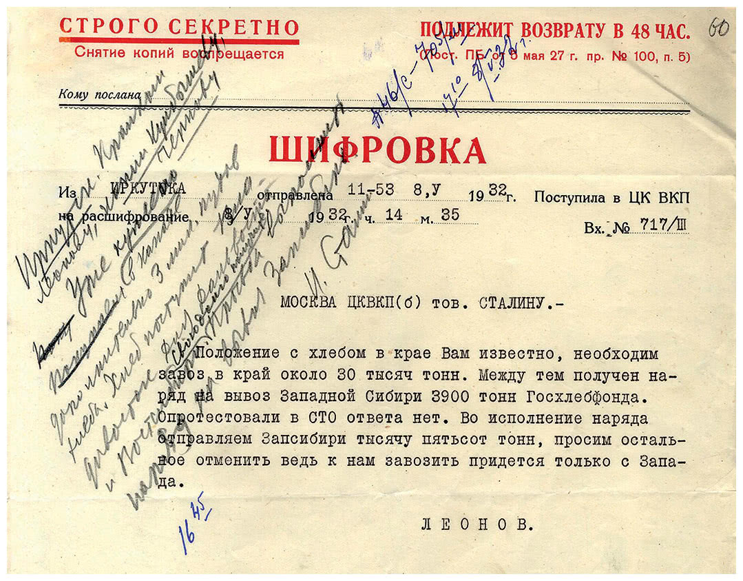 Экстренно закупается хлеб за границей, о чем, например, говорится в резолюции Главы государства на телеграмму от 8 мая 1932 года: «Уже куплено в Канаде дополнительно 3 млн пуд. хлеба. Хлеб поступит Владивосток для Дальвоста и Востсибири. Свою долю получите. Просьба выполнить наряд на вывоз Запсибирь»{546}.