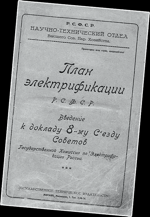 21 февраля 1920 года образуется Государственная комиссия по электрификации России (ГОЭЛРО). Постановление о создании ГОЭЛРО мотивировано следующим образом: «России впервые представляется возможность приступить к более планомерному хозяйственному строительству, к научной выработке и последовательному проведению в жизнь государственного плана всего народного хозяйства. Принимая во внимание первенствующее значение электрификации в деле использования основных природных запасов энергии, имеющихся в пределах России в колоссальных количествах в виде залежей разнообразного топлива и в водных силах; учитывая всю выгодность сосредоточения производства силовой энергии в районных электрических станциях, стоящих у этих первоисточников природной энергии и могущих наиболее совершенным образом распределить таковую сетью электропередач по всей стране; оценивая значение электрификации для промышленности, земледелия, транспорта и удовлетворения культурных нужд населения, в особенности же возможность для широких масс крестьянства воспользоваться осветительными и силовыми проводами электрической энергии для удовлетворения своих основных нужд и тем самым достигнуть могучего сдвига в приобщении деревни к культурным благам города и подъема крестьянского сельского хозяйства и крестьянских подсобных промыслов»{71}.