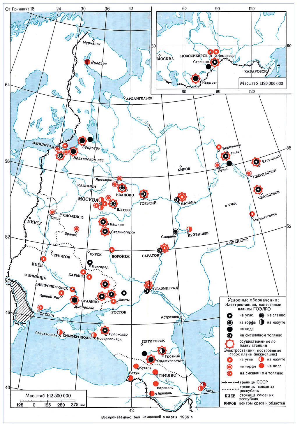 Предприятия по производству электроэнергии возводятся по территориям в соответствии с распределением естественных производительных сил, в основу которого положены данные КЕПС о естественных производительных силах в части источников электроэнергии – водных ресурсов и полезных ископаемых (уголь, торф и др.). Там, где позволяют ресурсы, строятся электростанции смешанного типа. «Наши электроцентрали должны были вскрыть и объединить в ‹народном хозяйстве› ту энергию, которая веками накоплялась и в лесах севера, и в торфяных болотах севера и центра должна была пустить в ход плохие сорта местных углей и отбросы угольных разработок, и волжские сланцы, и нефтяные газы, и водную энергию рек и потоков севера, юга, востока и запада»{78}. Распределение показано на Рис. 12.